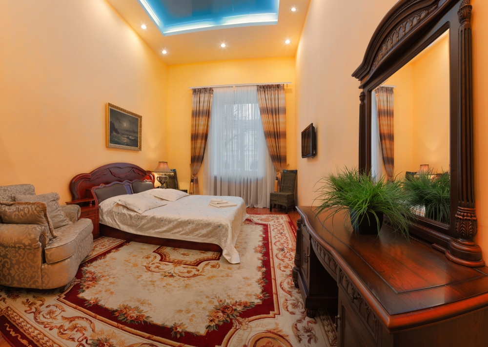The total area of the room is 38 sq.m. Height of the ceiling is 4.5 m. The room has separate entrance. The windows are giving to the Deribasovskaya street. Concept of the room equally answers both classical, and modern design. Two convenient single beds, a chair, a desk, paintings, an air-conditioner, a plasma TV, Wi-Fi, a cozy leather chair and a case for clothes.
